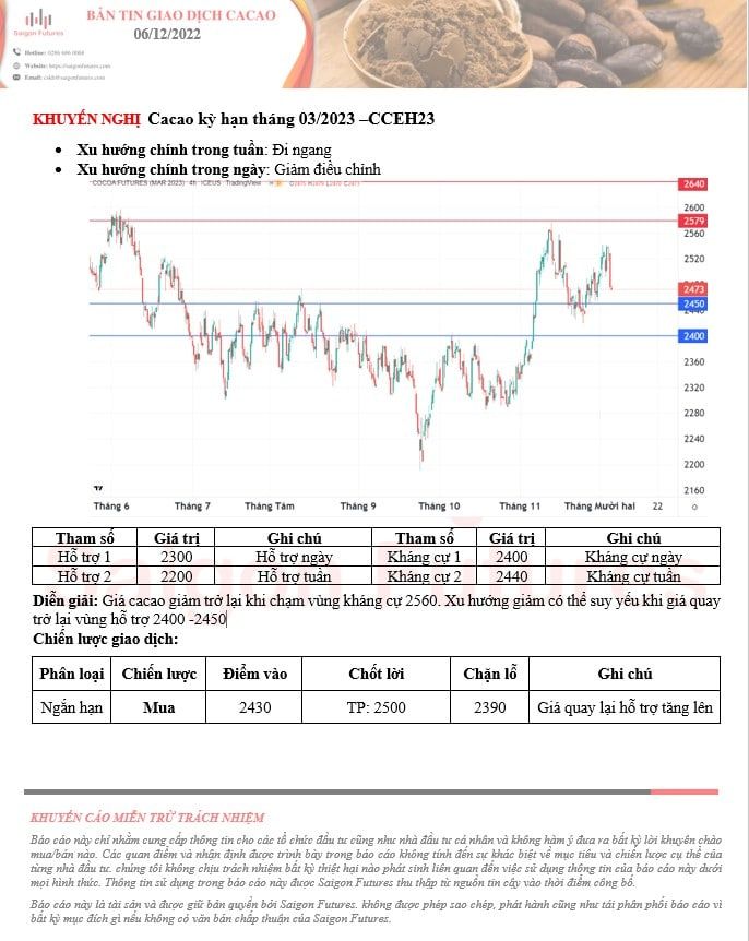 -View kỹ thuật Cacao kỳ hạn tháng 03/2023 (CCEH23) đầu ngày 06/12/2022